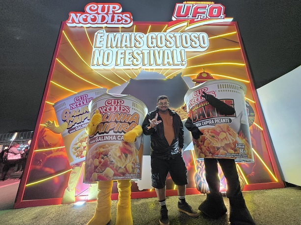 E como não podia faltar, demos um pulo no stand da Nissin — sempre o melhor pit stop! Além de preços bem acessíveis, teve muita resenha com a Andressa Feitosa – gerente de Cup Noodles e U.F.O.. Ela entrou na zoeira, rendeu vários “kikikis” e ainda rolou fotinho icônica com os Cups Man. Esse tipo de rolê é só amor!