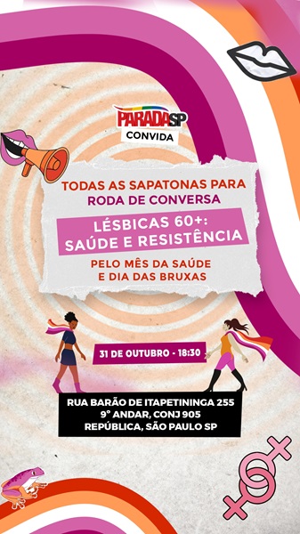 Na próxima sexta-feira, 31 de outubro, a ParadaSP, organizada pela APOLGBT-SP (Associação da Parada do Orgulho LGBT de São Paulo), realiza uma roda de conversa especial voltada para mulheres lésbicas com 60 anos ou mais, abordando temas de saúde, resistência e vivências. O encontro acontece na sede da entidade, localizada na Rua Barão de Itapetininga, 255, conjunto 905 – República, a partir das 18h30 — bem pertinho da estação República do metrô (saída Barão de Itapetininga).