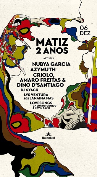 O line-up reforça essa vibração: a saxofonista britânica Nubya Garcia, referência do jazz contemporâneo afro-diaspórico ✨, a lendária banda brasileira Azymuth, ícone do samba-jazz e da fusion eletrônica, e o trio Criolo, Amaro Freitas e Dino d’Santiago, em apresentação inédita que mistura rap, piano e canto espiritual em um gesto sonoro multiatlântico. Completam a programação os residentes da casa, DJ Nyack, Lys Ventura b2b Janaina Nas e o duo LOVESONGS (DJs Eunaotodoido e Kevin David), fortalecendo a identidade afetiva e sonora do Matiz ️.
