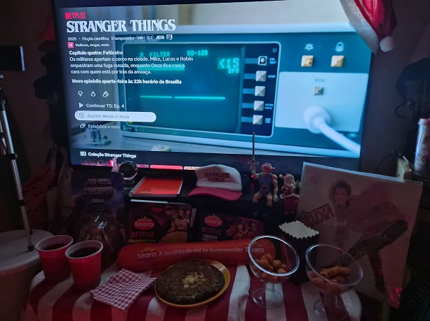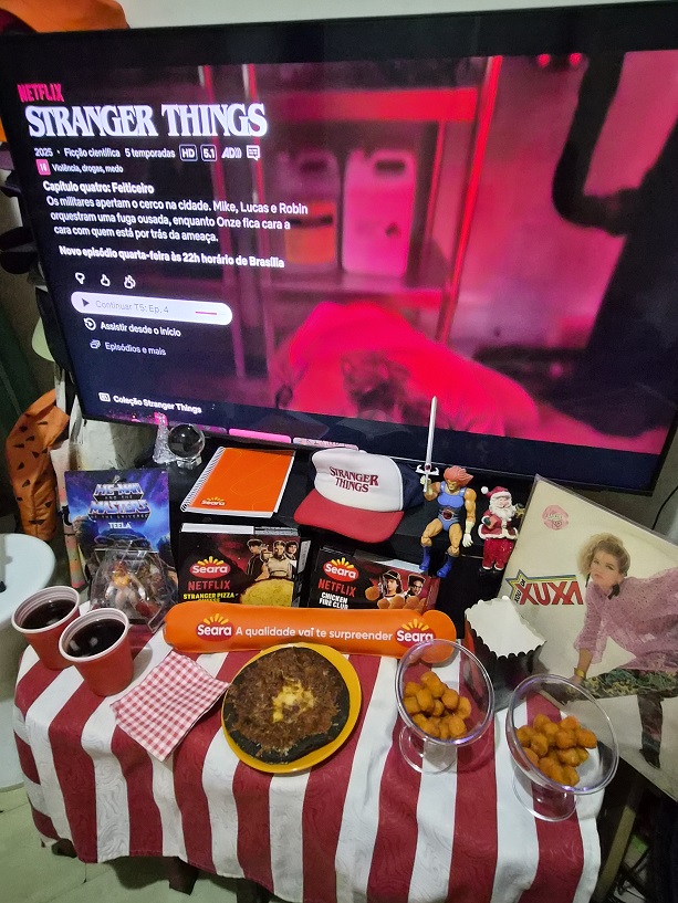 Assisti tudo de madrugada em excelente companhia que foiram as delecías da linha da série feita pela Seara como a Pizza Stranger de mussarela (também tem de pepperoni) e franguinhos apimentados de leve do Chicken Hell Fire que o Kauê Naccarato da produção devorou mais rápido que um ataque do Vecna.
