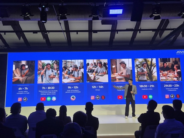 O evento marcou não só a chegada do novo aparelho, mas também o posicionamento da marca colando cada vez mais com o público jovem. E pra isso, chamaram ninguém menos que MC Hariel pra representar — só que o brabo não apareceu presencialmente por estar em tour na gringa 😢, mas mandou um salve no telão, mantendo a conexão com a galera.
